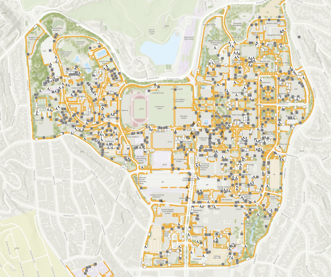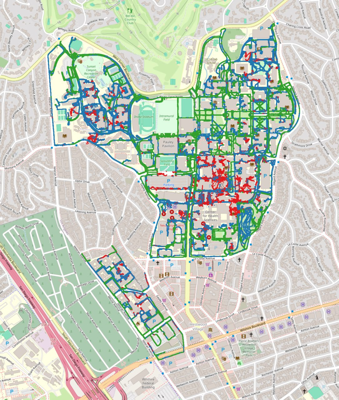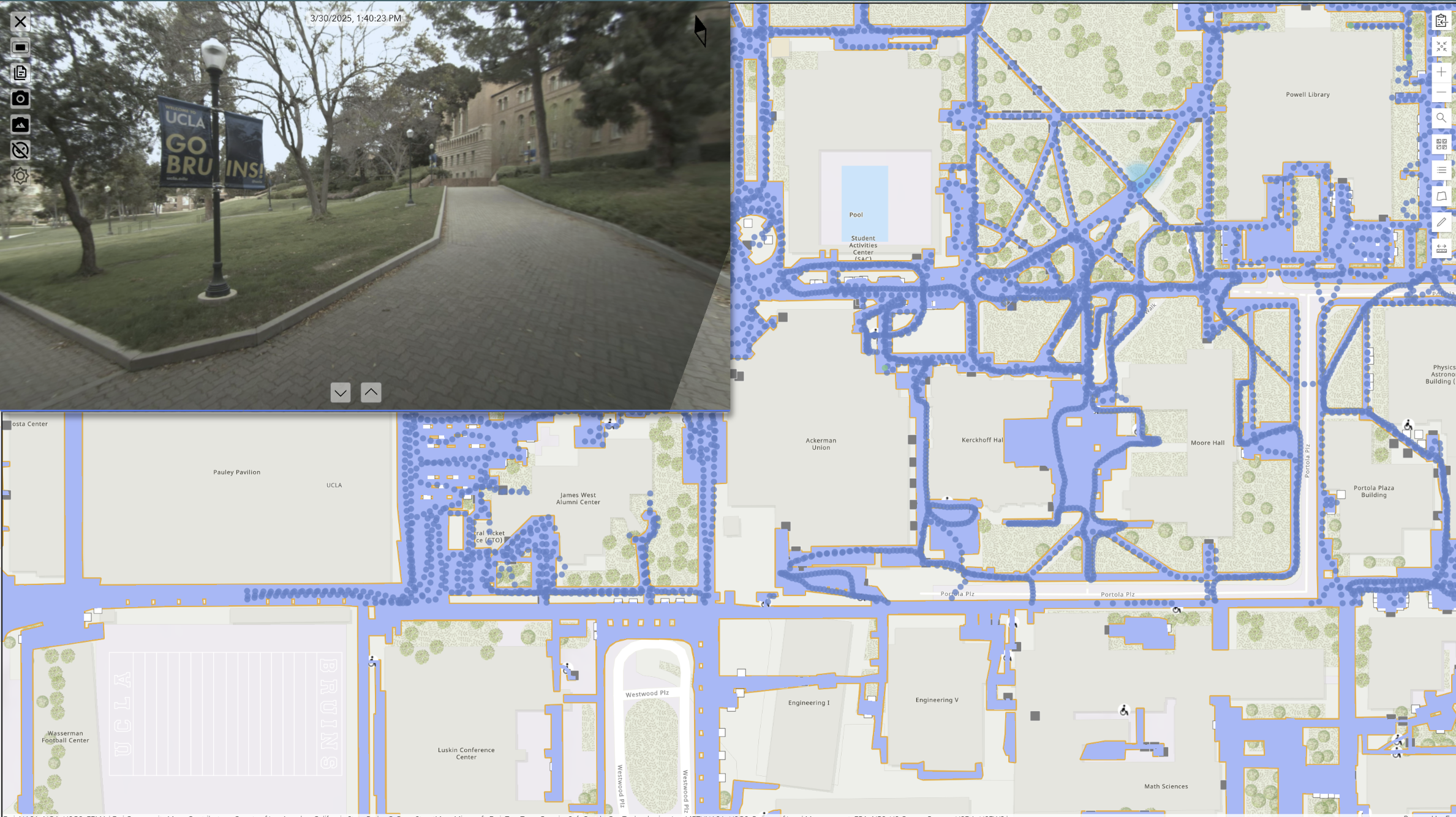 With decades of campus evolution and ongoing construction, UCLA needed verified, measurable data to support accessibility audits, facilities management, and event planning, which would improve UCLA’s ability to plan for and support significant events like LA28. The existing sidewalk data /map they had provided very limited value: it had centerline data only, did not include surface types, vertical features (i.e. stairs, ramps, etc.), actual widths, or slopes.