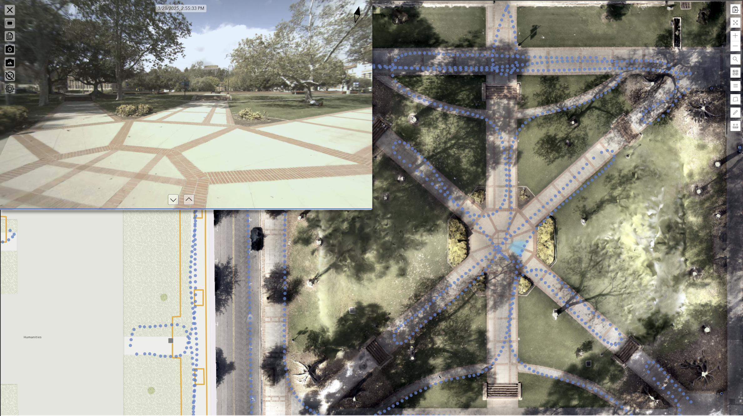 Capture: Over two weeks in March and April 2025, GeoCam’s team imaged approximately 42 miles of sidewalks, plazas, and pathways. Using a combination of walking, e-bikes, e-scooters, and driving cars; equipped with the GeoCam 360° high-accuracy cameras, the team logged high-resolution imagery, GNSS positions, and camera metadata.